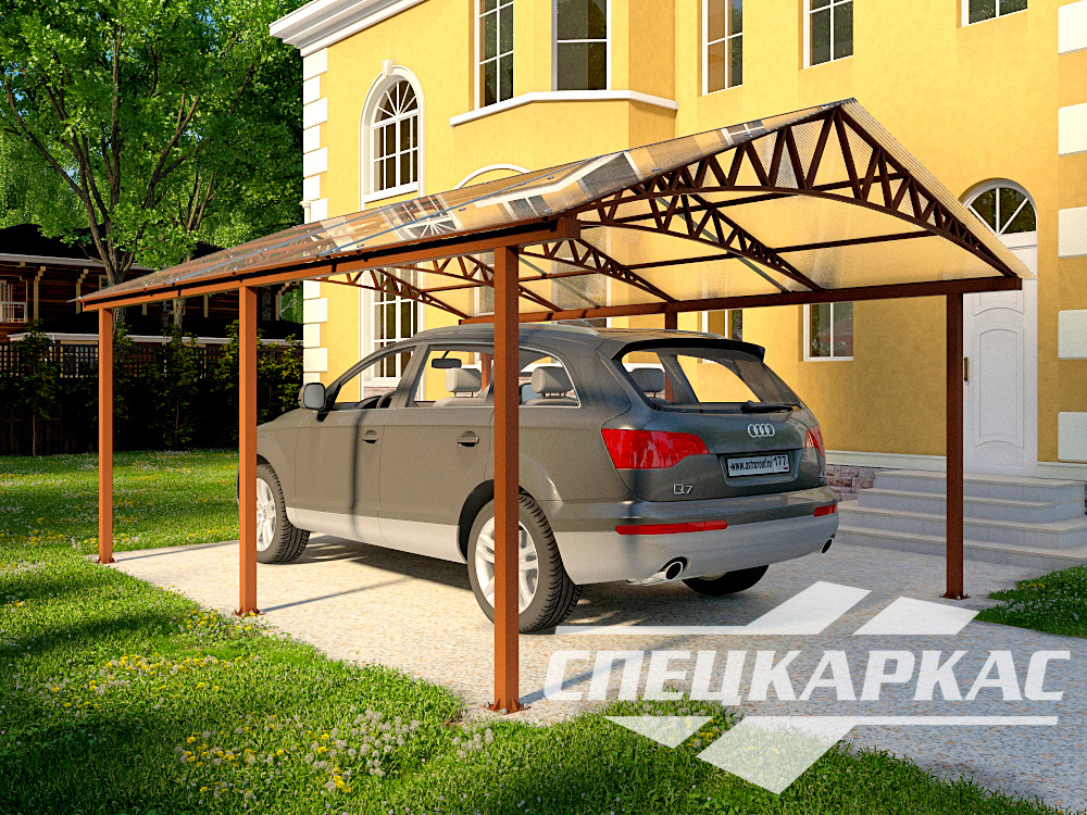 • Навес может комплектоваться следующими вариантами кровли: сотовый поликарбонат, монолитный поликарбонат,  профнастил, металлочерепица, мягкая кровля.